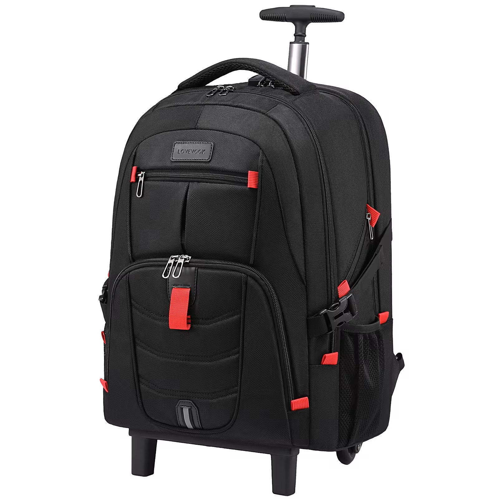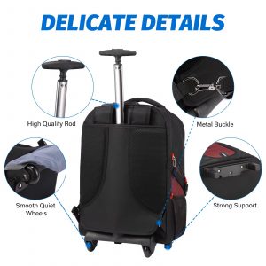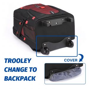 Large capacity Backpack with trolley: Top pocket, front access pocket, padded laptop compartment.