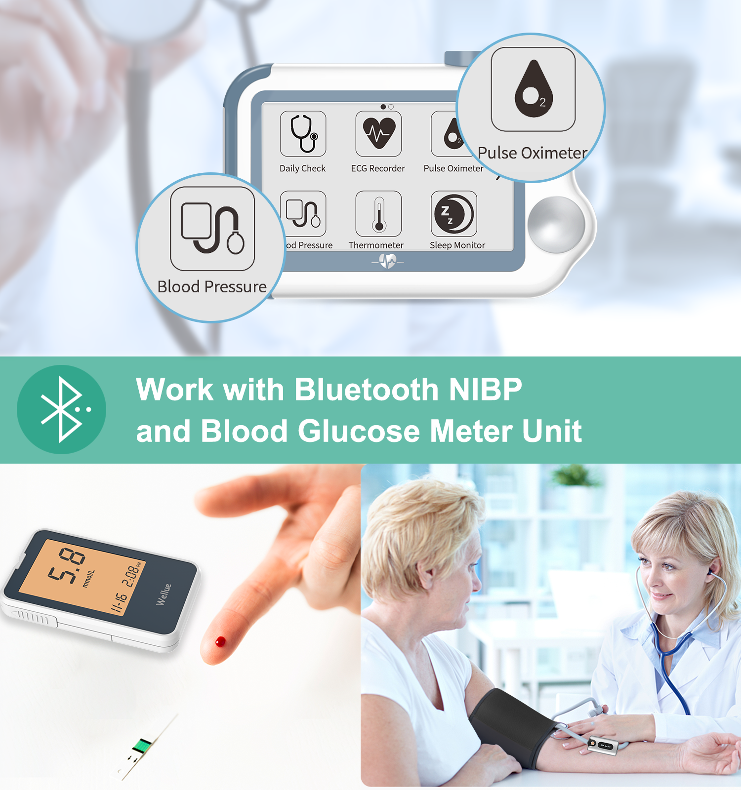 - All-in-One Health Monitor : Integrates ECG/EKG, ECG Holter, SpO2 (Oxygen Saturation), PI (Perfusion Index), NIBP (Non-Invasive Blood Pressure), Blood Glucose Meter, TEMP, and Pedometer in one device with a palm-sized design can manage 12 users in device.